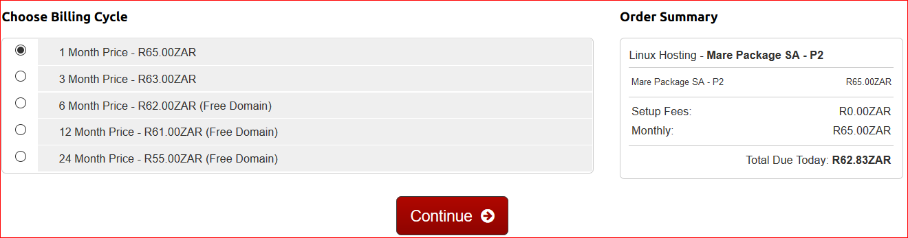 Stallion Hosting offers discounts on advanced payment options (quarterly, semi-annual or annually) as well as a free .co.za domain name if you select to pay for your hosting on a 6, 12 or 24 month cycle.